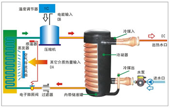 长朗热泵热水机是继燃气热水器、电热水器和太阳能热水器之后的新一代热水装置,是一种可替代锅炉及其它热水器的供暖设备。长朗热泵热水机吸收空气中的热量,充分利用了免费能源,它是完美地结合电热水器和太阳能热水器各自优点的安全节能环保型热水机。长朗热泵热水机是利用新能源的设备之一,产品一年三百六十五天全天候运转,不受恶劣天气的影响;相同的制热量,长朗热泵热水机的用电量仅是电热水器的四分之一左右,天天节约了电能。热泵热水机是先进发达国家普遍所推荐使用的绿色环保产品,在发达国家已相当普及。![]() 长朗热泵热水器节能原理 一般的电热水器加热方法,是简单直接将高品位电能转换成低品位热能来将水温升高,即用一度电形成860大卡的热量(未计过程中的热损耗)来提高水温。众所周知,在我们周围的环境中,物体一般有三种相态,即气态、液态和固态。当温度发生变化时则会互相转化 比如水,如果从液态转化为气态,需要吸收大量的热能(蒸发过程);反之如果从气态转化为液态,则会放出大量的热能(冷凝过程)。长朗热泵热水器正是利用了这一物理原理,将制冷剂作为工作介质,利用压缩机做功,使工质的相态循环往复地发生变化:制冷剂不断地在蒸发器中蒸发吸热(从空气中吸收热能,制冷剂由液态变成气态),再经压缩机对制冷剂做功将热量转移至冷凝器中散热(制冷剂由气态变回液态放出热量,水箱中的水吸收热量后水温提高),从而实现只是利用少量的高品位电能,就能将空气中的大量的低品位热能“搬运”到水中。实验证明同样一度电用于热泵系统中从外界吸收的热量是三倍于860大卡的热量,故长朗热泵热水器的用电量只有电热水器的四分之一。 |